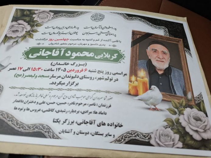 با دلی آکنده از غم و اندوه به اطلاع می رساند مراسم چهلمین روز درگذشت کربلایی محمود آقاجانی (پدر دکتر حسن آقاجانی شهردار اسبق تولم شهر) روز پنجشنبه ۶ فروردین ساعت ۱۵:۳۰ الی ۱۷ در مسجد ولیعصر (عج) برگزار می گردد